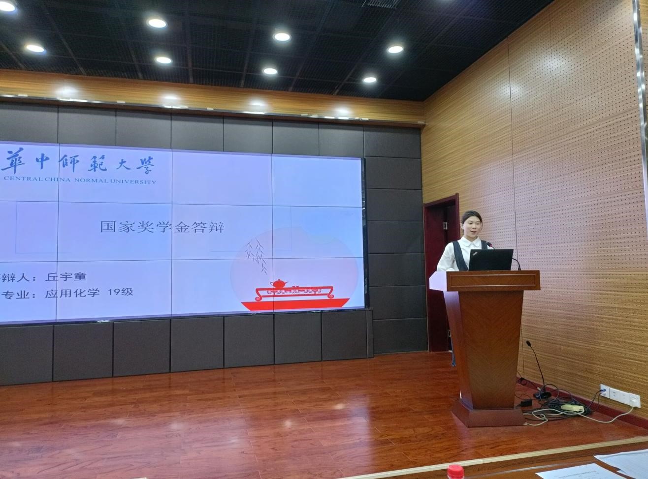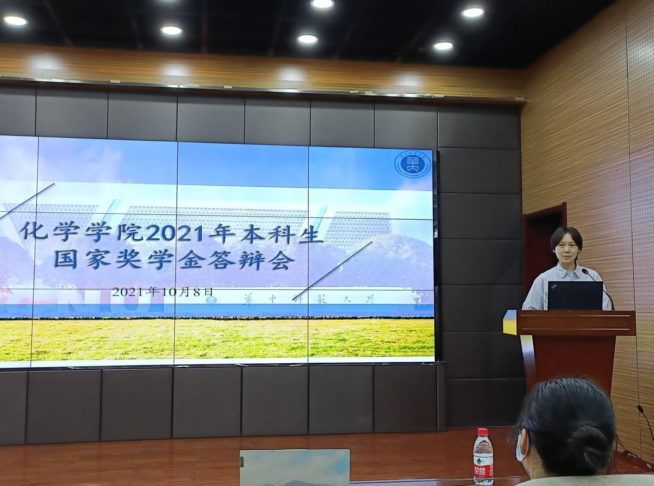 新闻中心消息 通讯员 郭雅婧 许敏婧 喻欣蓓10月8日晚上,华中师范大学化学学院2021年国家奖学金答辩会在化学楼L823顺利举行。出席本次活动的嘉宾评委有化学学院党委副书记徐芬、化学学院副院长原弘、教师代表金山、李盛彪、朱晓磊、黄雪英、王世存、程靖、蔡萌、王凡、徐浩、叶飞、化学学院团委书记马莹、团委副书记孙煜林、本科教学秘书陈幼琳、2020级辅导员聂敏、2021级辅导员安晓蕾、兼职辅导员吴瑶瑶、兼职辅导员姚绮妮以及学生代表李薇、余国铭、武永梅、王一戈。化学学院2021级部分新生在现场观看答辩会,其余各年级学生通过腾讯会议观看答辩直播。答辩会由兼职辅导员姚绮妮主持。