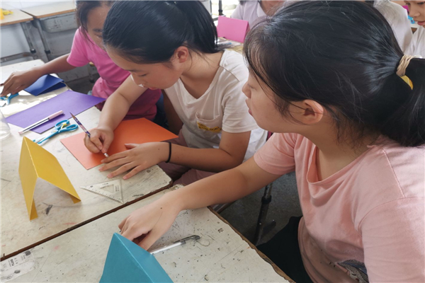 下午佘香霖进行了支教期间的第一次手工课。佘香霖带着教具走进教室时,同学们表现得十分兴奋,跃跃欲试。手工教具包括儿童剪刀、胶棒、彩色卡纸和彩色毛根。彩色卡纸用于制作名牌,放在课桌上以便老师们能更快记住学生名字。彩色毛根用于装饰制作的名牌。刚开始学生们不知道如何下笔在卡纸上画出自己名牌的图案,于是佘香霖在黑板上提供了几种图案以激发学生的思路,还给学生们展示了自己制作的作品。随后学生们开始用毛根制作名牌上的装饰品,佘香霖在讲台上为大家展示萝卜、花朵、蝴蝶的折叠方法,学生们掌握很快,而且还发挥创造力制作出了其他图形:太阳、云朵、爱心……下课时间很快来临,有的学生还没有完成自己的手工作品,大家都还意犹未尽。佘香霖安慰同学们说:“大家不用着急,可以带回家继续完成,完成的同学下节课就可以将名牌摆在桌子上了。”