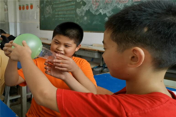 在为期15天的支教生活中,支教团成员不仅为白水中学的学生们安排了学校的常规课程,还为他们安排了物理实验课和化学实验课,旨在丰富他们的学习生活,让他们在自己动手操作中切实感受到科学的魅力,提升他们的综合素质。在今天下午的化学实验课中,王秀厅利用化学中的理想气体状态方程,结合生活中常见的物品,为学生们带去了一节生动有趣的化学实验课。学生们先向一次性水杯里倒入热水,杯子变热后把水倒掉,然后迅速接到气球上,待杯子变凉后即可松手。由于杯子内外压力差的作用,杯子就可以被“吸”在气球上。这节课程结束后,王秀厅表示:“让同学们自己动手完成这个实验,能让他们切实感受到科学的神奇之处,本节课课堂气氛很活跃,同学们的积极性也很高。”