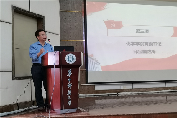 紧接着,邱宝国对本次开幕式致辞。他提到,从2019年到2021年,学生骨干训练营活动已经走过了三个年头,三年来不断发展完善,已经成为了化学学院的一项品牌活动。而本次活动的初衷既是对党员的培养,也是对入党积极分子的培训,希望通过本次培训能够提升入党积极分子的思想理论水平,同时能够坚定同学们的理想信念。他强调,每一位党员和入党积极分子既要学习党章也要与时俱进,认真观看并领悟习近平总书记在庆祝建党100周年大会上的讲话。今年处于“两个一百年”奋斗目标历史交汇的关键节点,学习党史是今年贯穿始终的政治任务。邱宝国引用习近平总书记在党史学习教育动员大会上的重要讲话,从“如何学史明理、如何学史增信、如何学史崇德、如何学史力行”向同学们提出了四点希望与要求:他希望学生党员们能够学史明理,不断提升政治理论水平,筑牢理论的根基。政治上的坚定源于理论上的全面,所以学党史除了学习党章外,还要阅读四本课外书,通过阅读原著细细品味,让党的思想入脑入心;他希望学生党员们能够学史增信,更加深刻地理解中国共产党为什么能,中国特色社会主义为什么好,马克思主义为什么行;他希望学生党员们能够学史崇德,百年党史是一部奉献史,是无数模范牺牲小我书写而成的伟大奋斗史,同学们要用实际行动扛起责任,以时不待我舍我其谁的精神为国为党做出贡献;他希望学生党员们能够学史力行,不断增强本领才能,他强调道大学生的本职任务还是学习,发展党员首先要政治思想方面正确,同时还要学习成绩优异,才能在年级上起到带头作用。讲话最后,邱宝国鼓励学生党员们“征途漫漫,唯有奋斗!”祝愿每一位党员和入党积极分子都能够在本次培训中收获满满。