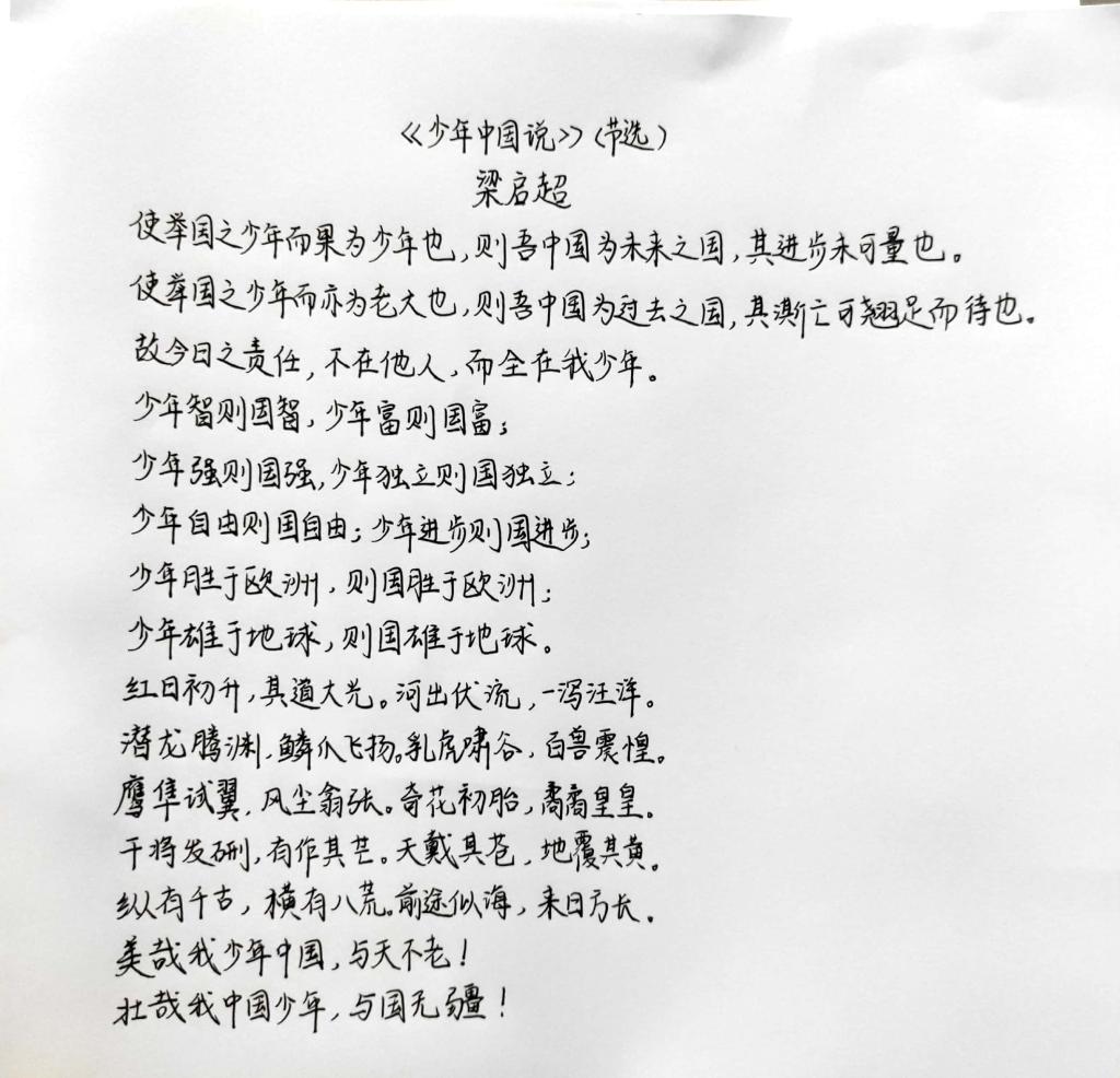 作品简介:戊戌变法后,为了驳斥帝国主义分子污蔑中国是“老大帝国”的无耻滥言,唤起人民的爱国热情,激起民族的自尊心和自信心,梁启超于日本流亡时写下《少年中国说》。本人想借此比赛,以文中片段节选,勉励同龄人积极进取,奋发向上。