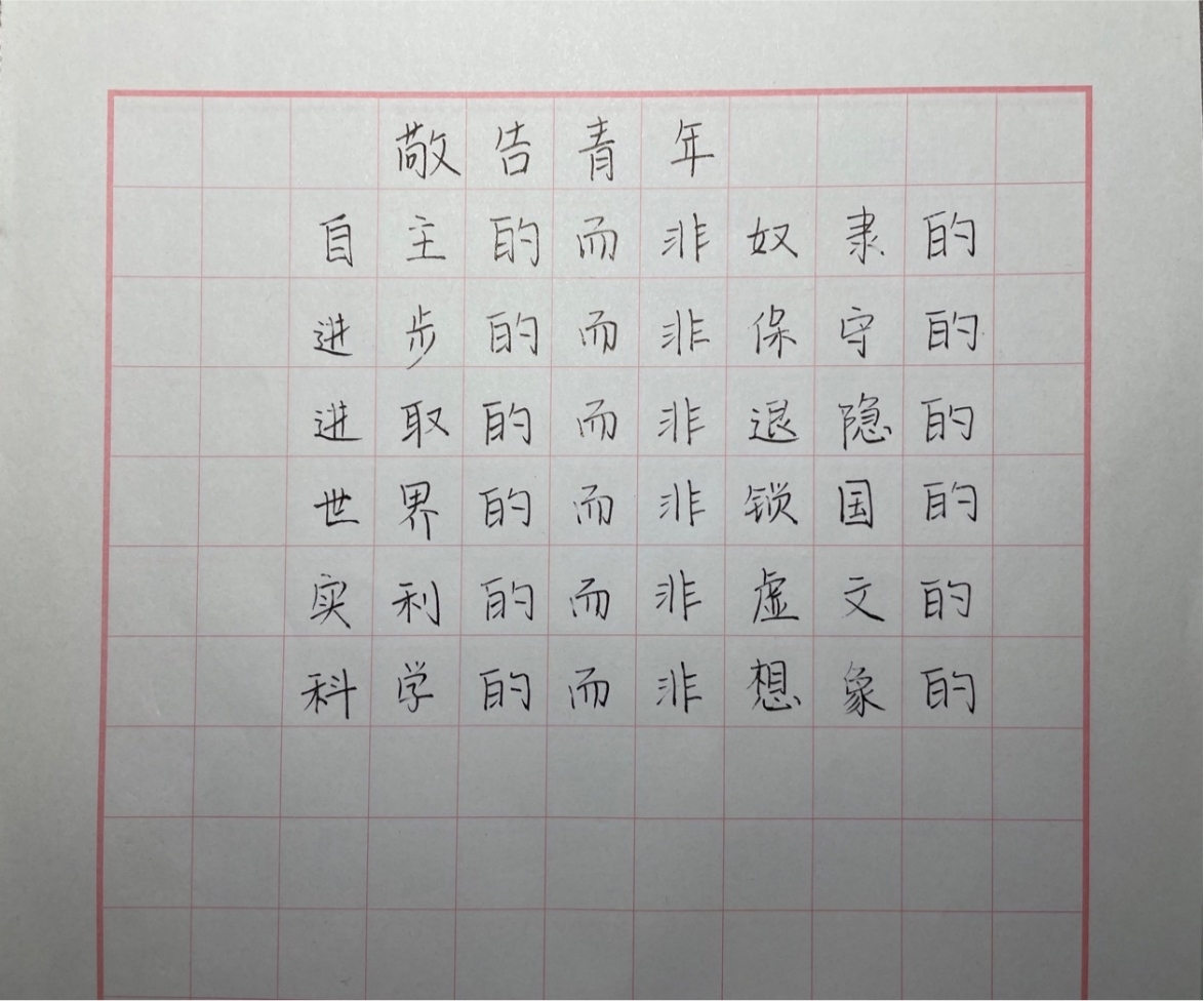 作品简介:在建党一百年之际,结合近期热播的《觉醒年代》,以“敬告青年”来激励自己,不忘前人对青年的期望,做一个自主、进步、进取、世界、实利、科学的新青年!