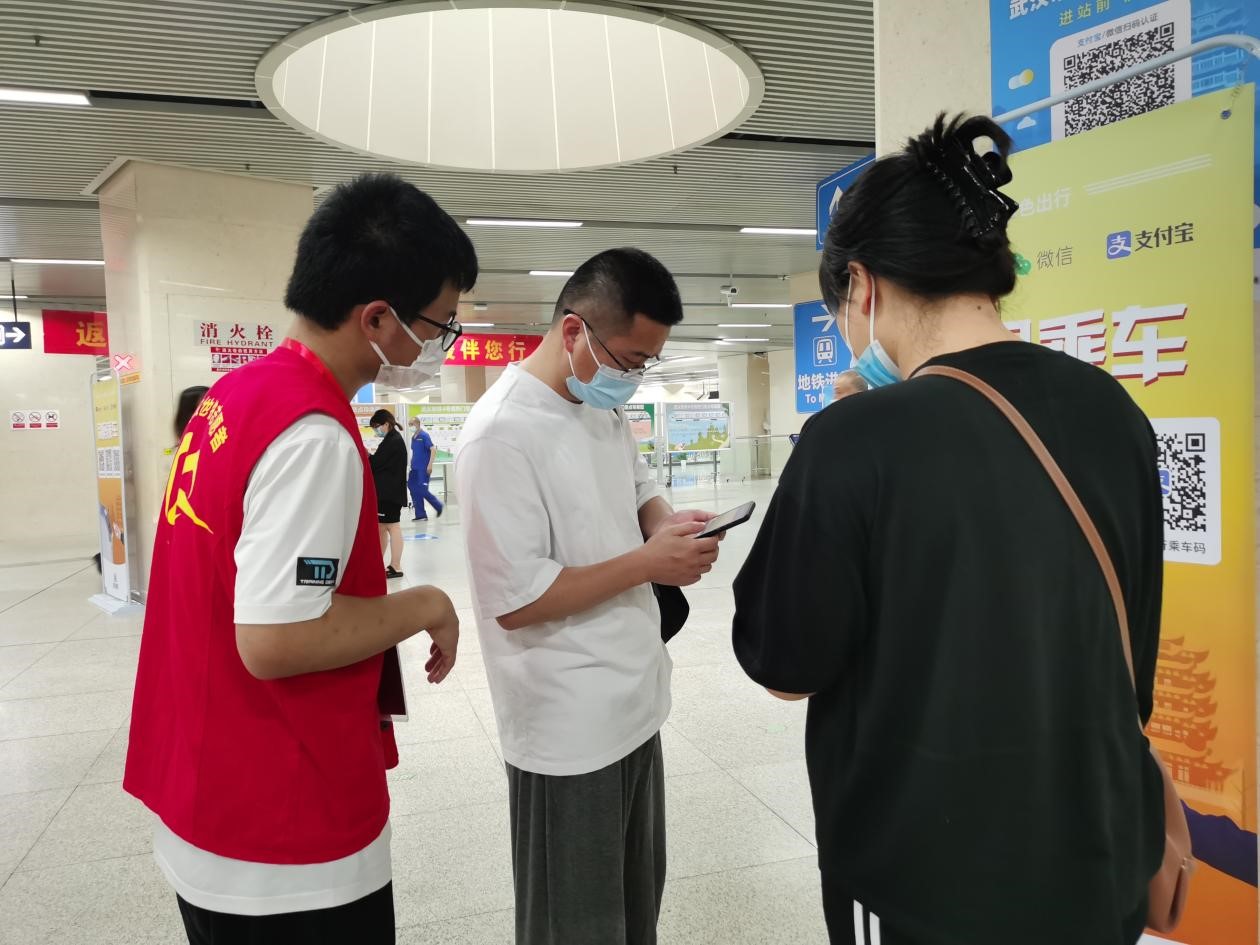 武汉地铁已启动与支付宝、微信、银联支付的合作,市民乘客可刷支付宝、微信、云闪付APP二维码过闸。志愿者杨文卓在人流量大的自动售票机附近协助工作人员推广武汉地铁第三方APP刷二维码过闸业务,满足乘客地铁出行多元支付的需求。自动售票机处排队购买车票的乘客很多,杨文卓就主动推荐乘客使用支付宝、微信、云闪付APP刷二维码过闸,并帮助乘客完成乘车码的申领和开通。
