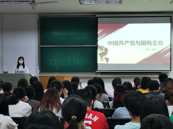课程开始前,由三位同学上台进行分享。化学学院第4小组范昕妍以中国共产党和国有企业为主题,讲述了央企党员的信仰——不分年龄、不分年代、不分领域。美术学院第5组黄思琪向大家分享了党员英雄故事,追忆了杨靖宇、王伟、邱少云、刘胡兰四位革命前辈的感人事迹。美术学院第6组覃弋则通过一段视频讲述了为什么资本主义后是社会主义。