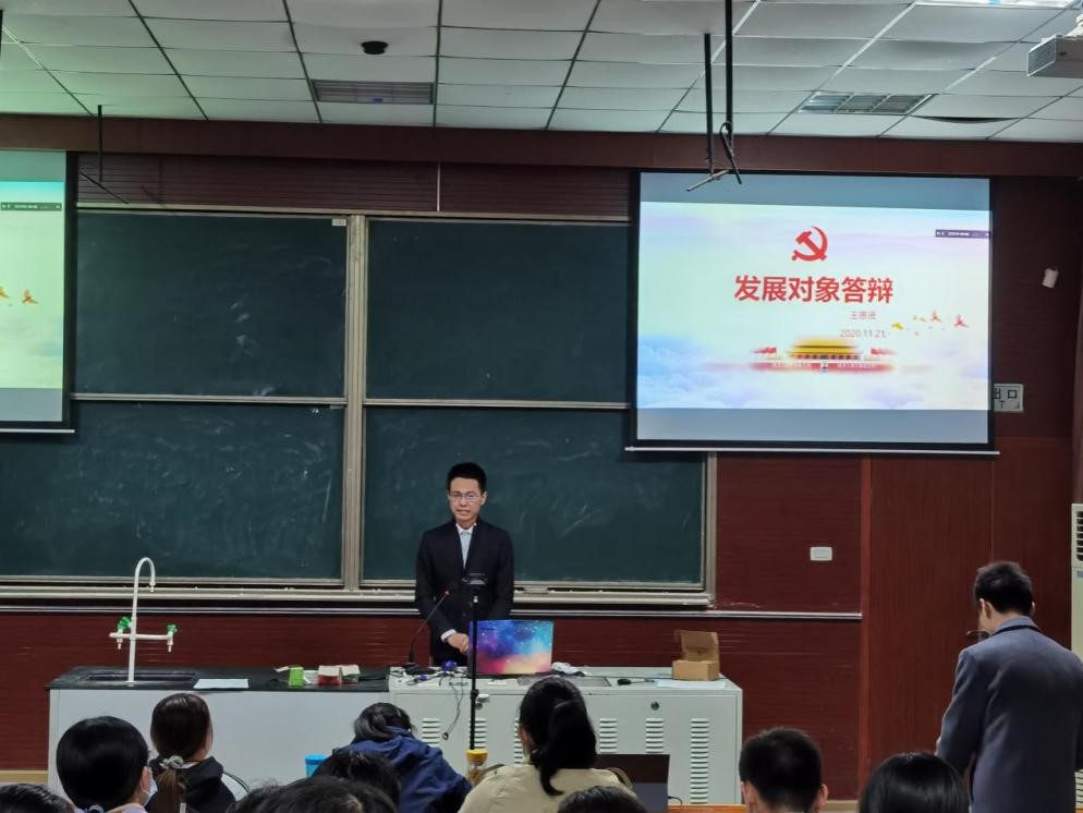 新闻中心消息 通讯员 时路佳 11月21日晚,化学学院2017级入党积极分子推优答辩会在H201教室(线下)和腾讯会议平台(线上)同时开展进行,并通过哔哩哔哩平台现场直播。本次答辩会旨在展示2017级入党积极分子的入党动机、对党的认识以及大学期间综合表现与成长等各方面的风采,从中推选出拟发展对象人选,并为同学们提供学习交流的平台。参与本次答辩会的有本科生红石榴党支部书记武双欣、本科生菁英党支部指导老师兼2017级辅导员安晓蕾、化学学院2017级本科生红石榴党支部、菁英党支部全体成员和2017级各团支部团员及群众代表,共有19名入党积极分子参与答辩。答辩会由本科生红石榴党支部支委姚庆晨主持。