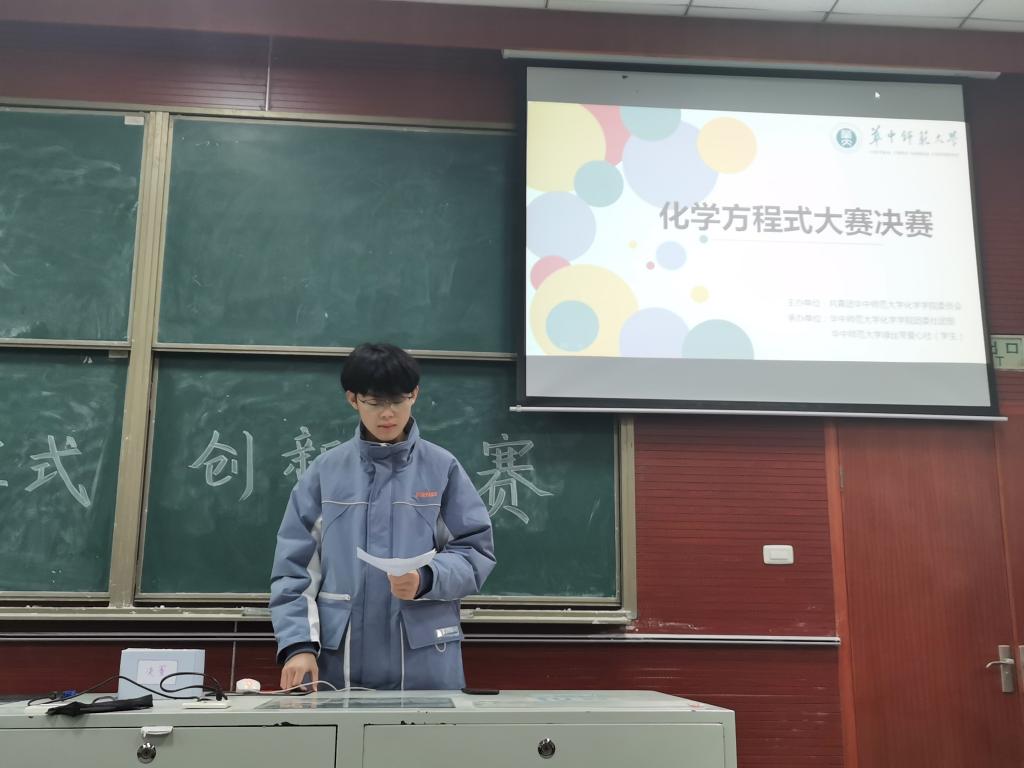 新闻中心消息 通讯员 杨苒 张靖怡11月22日上午,化学学院第十二届化学周系列活动之化学方程式创新大赛决赛在逸夫化学楼201教室成功举办。此次比赛由共青团华中师范大学化学学院委员会主办,华中师范大学化学学院团委社团部、华中师范大学绿丝带爱心社(学生)承办,旨在激发大学生对化学知识的兴趣,提升大学生自身化学素养,培养其团结合作精神。本次大赛邀请到了化学学院团委书记马莹、化学学院学生团委副书记肖仁可,由社团部学员孙晨炜主持。