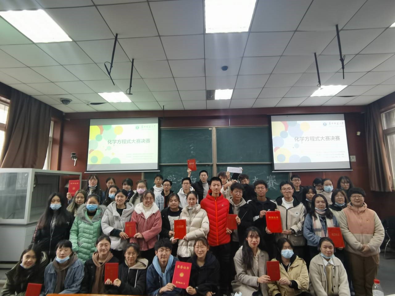 在现场工作人员统计得分后,因第六队与第七队分数相同,社团部负责人集体讨论决定增加一场加时赛。经过三个环节的激烈角逐,本次化学方程式创新大赛比赛结果公布如下:“啦啦队”获得一等奖,“阴间人队”和“怎么都队”获得二等奖,“也没倒装吧我觉得队”、“阿道夫队”、“我已经准备好了队”获得三等奖,其余队伍获得优秀奖。