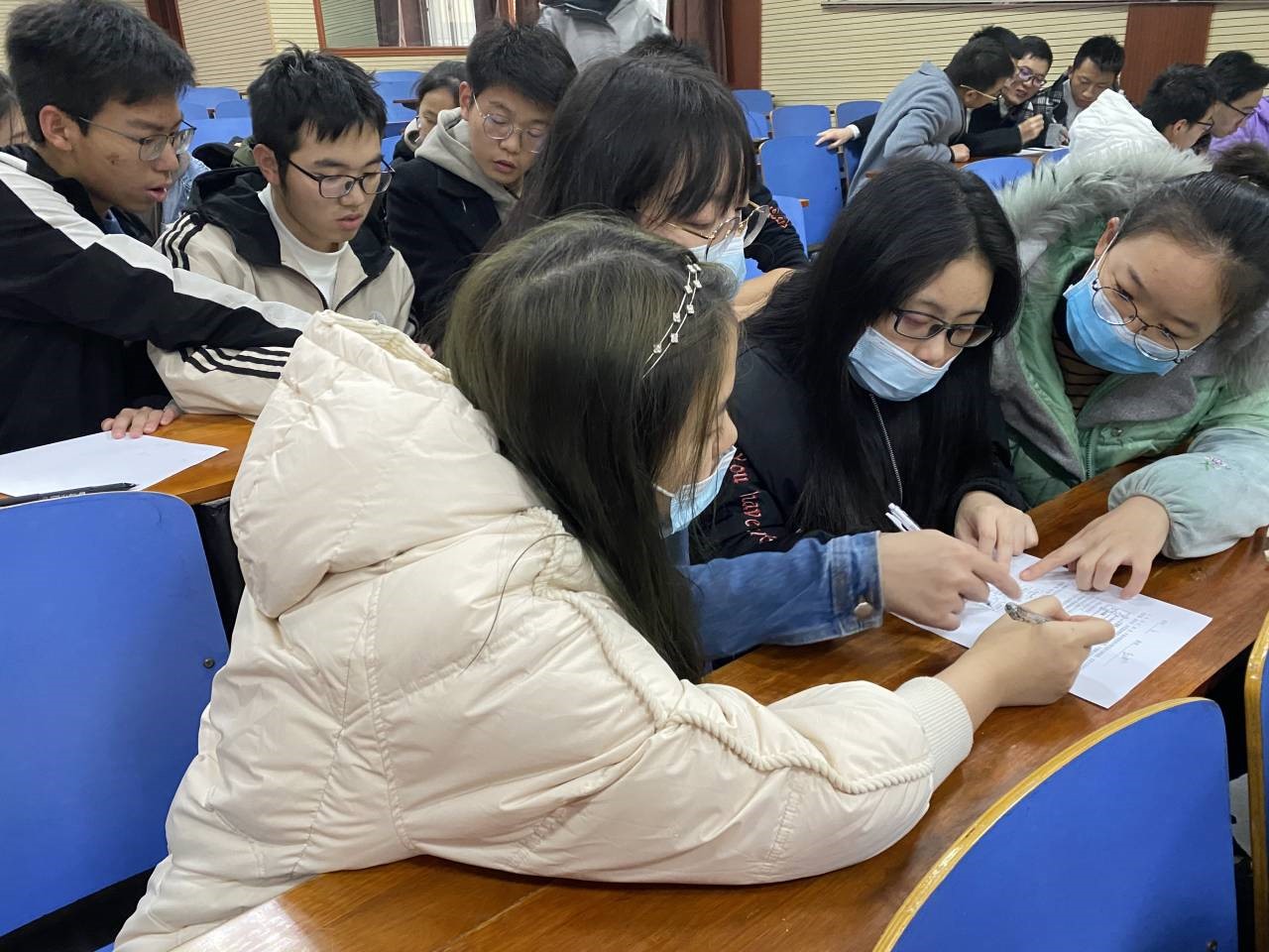 在主持人介绍完比赛规则之后,场上的队员们跃跃欲试,讨论着战术安排。笔试题一开始,各队便高度集中注意力,打起十二分精神,或激烈商讨方程式的条件状态,或安静排查方程式的漏洞,或奋笔疾书记录下讨论成果。短短的十五分钟赛程凝聚了各队成员智慧的结晶,每一张答卷的背后都是一次全力以赴的拼搏。