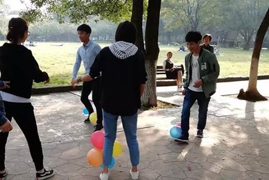 同学们围坐在草地上,分享零食,交流感受。在短暂的休息之后开始气球大战,每一组派出四名成员在一定时间内吹气球。同学们在刚开始吹气球时并不熟练,但经过练习摸索,不一会便能够迅速地吹好气球。在踩气球活动中,同学们玩得很是尽兴,欢呼声、笑声不断,甚至吸引了许多人观看。