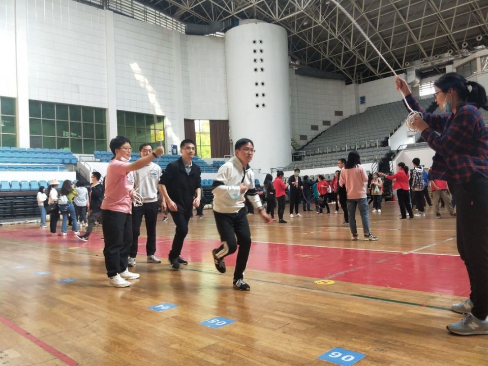 在佑铭体育馆馆内,举行着教工的跳绳比赛。跳绳一次次甩在地上的声音,犹如毛辫一次次激励着选手们奋力起跳,跳出更多的次数。比赛开始后,选手们紧跟着彼此跳跃,丝毫没有浪费每一分每一秒,超常发挥出了自己的水平。虽然中间有两次失误而导致中途停止,但选手们彼此协调,让这些失误并没有耽误太多时间。最终他们以两分钟跳118个的成绩突破了自我!