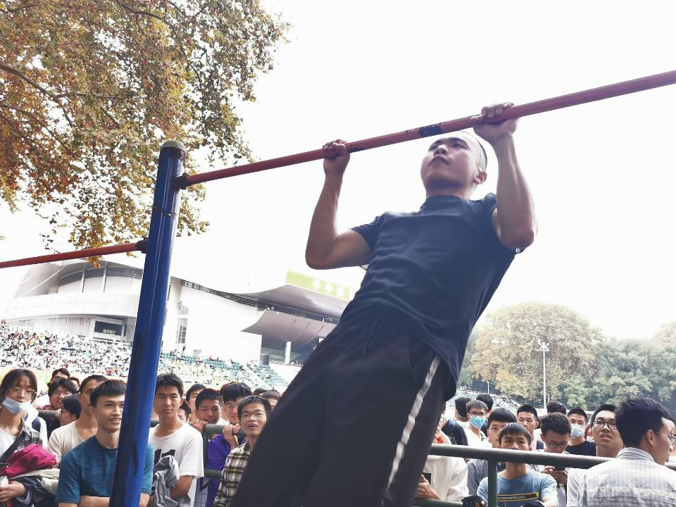 与此同时,在体育场的另一侧男子组引体向上比赛正在进行。比赛前,运动员们来到了比赛场地,负责人带领运动员做好热身运动,队员之间相互鼓励打气,坚定了拼搏到底的意志,更展现了他们活力四射的精神风貌。