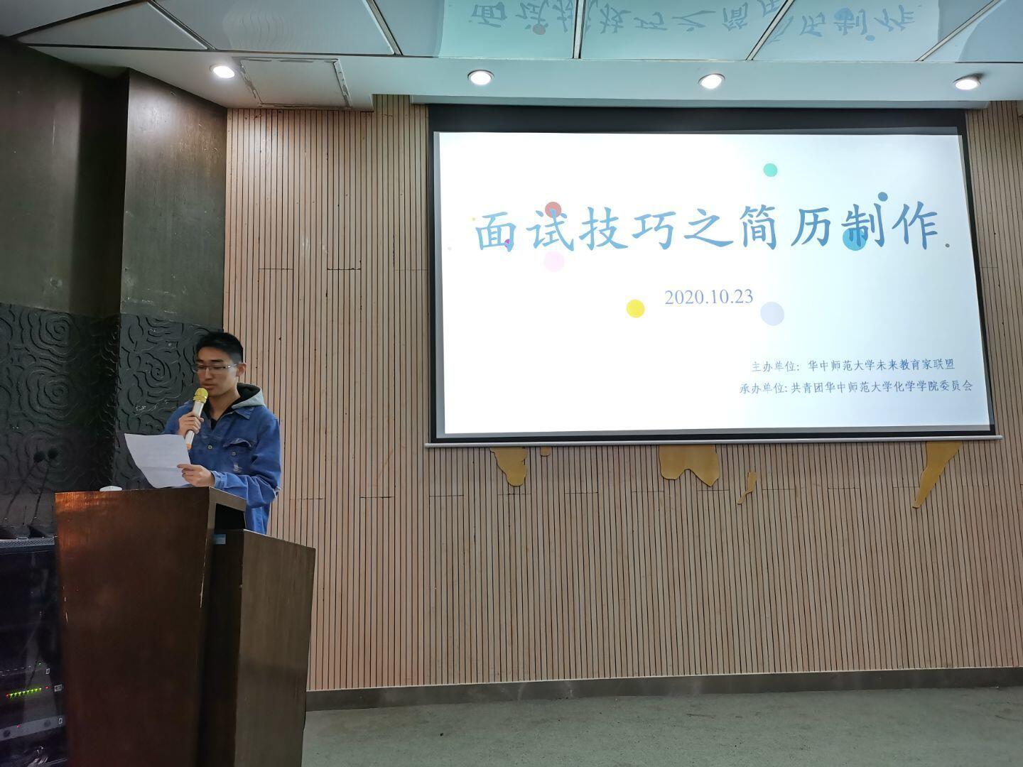 新闻中心消息 通讯员 林小艳 马可10月23日晚,化学学院星期五文化沙龙活动在十号楼一楼报告厅顺利举行。本次活动由华中师范大学未来教育家联盟主办,由共青团华中师范大学化学学院委员会承办。本次活动旨在分享求职策略与技巧、增加学生对简历制作的了解。此次活动邀请到了华中师范大学美术学院2019级辅导员张爱担任主讲人,由化学学院学生会学术科研部学员韩垒韬主持。