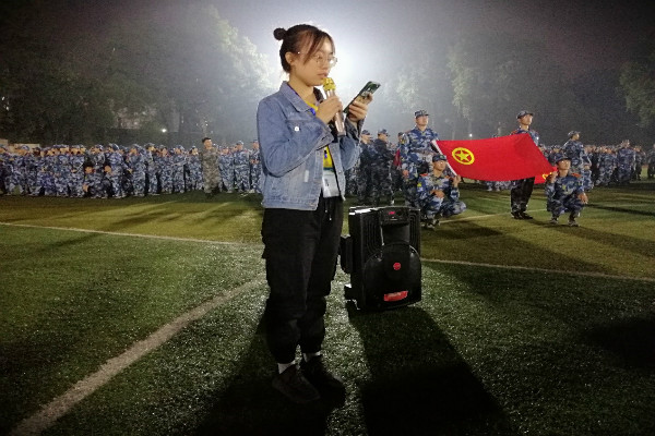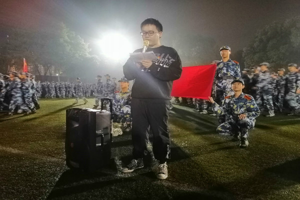 活动伊始,各学院整理队形,在操场中央依次排列,随后军训指挥官简单介绍了活动流程并宣布活动正式开始。随后,组织部部长蔡文婧带领2020级新生重温入团誓词,铿锵之声在操场上方回荡,展现了新生的一腔热血。接着,全体新生跟随伴奏齐唱团歌,激昂的歌声展示了新生昂扬向上的精神风貌,充分调动了新生的活动积极性 。