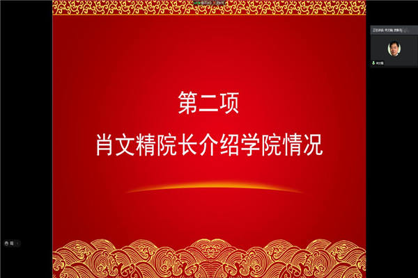 紧接着,由徐芬副书记介绍学生工作情况。徐芬首先简要介绍了本科新生基本情况和2020级本科生负责管理人员安排,接着她展示了学院学生工作情况、管理制度及人才培养。最后她建议新生家长们适度关注大学生状态并及时进行有效沟通。