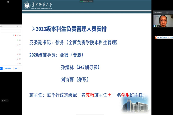 新闻中心消息 记者 周丹9月14日晚上,化学学院2020级本科生新生家长会在腾讯会议顺利举行。本次家长会由共青团华中师范大学化学学院委员会主办,由华中师范大学化学学院学生会学科部承办。本次会议旨在让家长们了解学校及学院的各项管理制度,介绍学院教学等基本情况,搭建学校与家长交流的良好平台。出席本次家长会的嘉宾有化学学院党委书记邱宝国、化学学院院长肖文精、化学学院党委副书记徐芬、化学学院教学委员会主任原弘、化学学院团委书记马莹、化学学院2020级辅导员聂敏、辅导员孙煜林和2020级兼职辅导员刘诗雨。家长会由2020级辅导员聂敏主持。