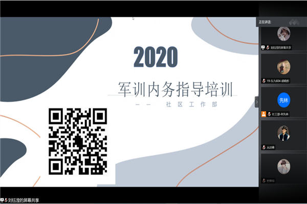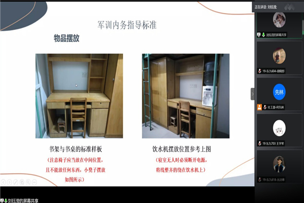 新闻中心消息 通讯员 努尔扎提9月12日晚,华中师范大学化学学院2020年军训内务指导志愿者培训在腾讯会议顺利举行。此次活动旨在让军训内务指导志愿者们熟悉内务指导标准,保证可以对新生进行准确的内务指导。培训邀请到了化学学院2019届社区工作部负责人刘钰滢担任主讲人。本次活动由共青团华中师范大学化学学院委员会主办,由化学学院团委社区工作部承办,由2020届团委社区工作部负责人何先林担任主持人。