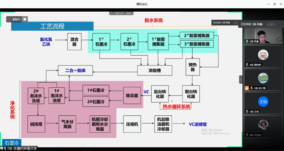 第三组由夏明扬、张鑫为代表进行“VCM(氯乙烯)工段”汇报。汇报主要从二合一、转化、精馏这三个生产工艺展开,涉及化学化工原理、工艺指标、流程设备、注意事项与解决方案等,全面细致地讲解了该合成工段。实习第四组张振同学提出“生产的氯化氢纯度为什么不能高于97%”问题,徐洋兵如是回答道:“受水冷夹套式钢制合成炉的限制,氯化氢浓度高于97%时易造成燃烧不充分的情况,一旦游离氯到下游工段会有较大安全隐患,可能引起气体混合爆炸。”