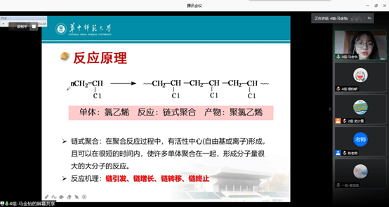 第四组由马金怡、陈蕾为代表进行“PVC(聚氯乙烯)工段”汇报。汇报从PVC的发展背景、生产原理、生产工艺、具体应用四个方面展开。其中,马金怡主要讲解了氯乙烯合成PVC的反应机理,并着重介绍了目前工业生产PVC的主要方法——悬浮聚合法的原理与影响该聚合的相关因素。陈蕾就生产工艺进行细致地介绍,包括反应物的准备与除杂、工艺流程、产品质量标准、安全问题等,并展示了PVC在医疗和生活中的广泛应用。