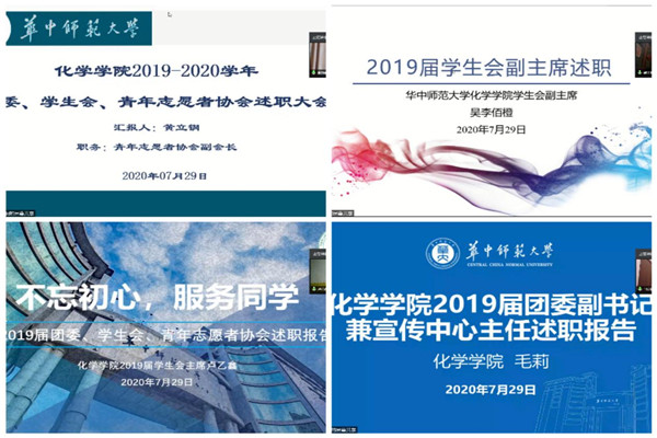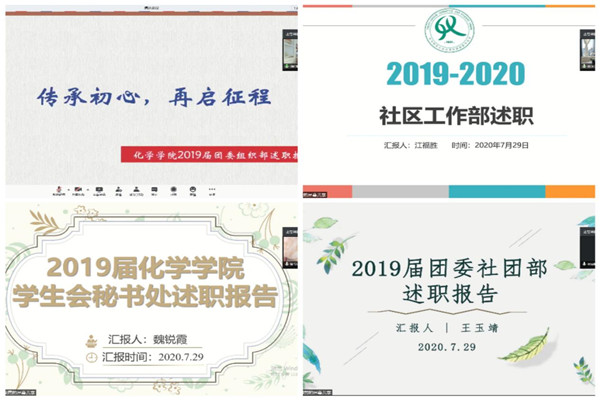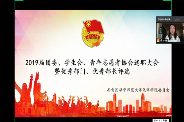 新闻中心消息 记者 周丹 祝冰倩7月29日晚,化学学院2019届团委、学生会、青年志愿者协会述职大会暨优秀部门、优秀部长评选活动于线上顺利举行。本次活动旨在总结各部门在过去一年的工作情况,评选优秀部门和优秀部长。出席本次活动的嘉宾有化学学院党委副书记徐芬、团委书记马莹、团委副书记梁晋华。参与本次活动的人员有2019届团委、学生会、青年志愿者协会的全体成员,2018、2019级学生年级干部及班委。本次大会由2020届学生会主席陈宇曦主持。