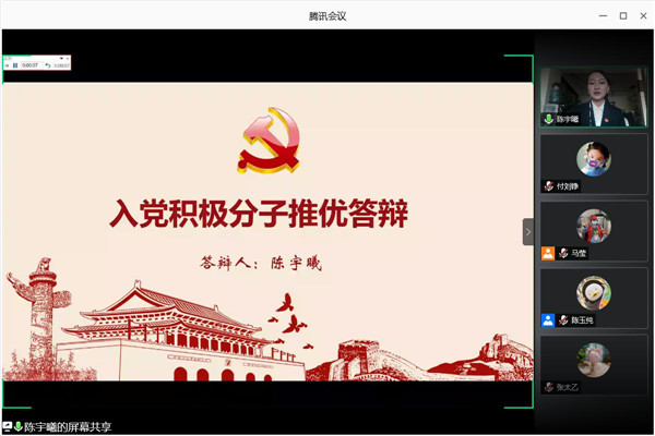 第九个进行答辩的是万坤,他表示疫情期间,张宏文医生和许多在危急关头挺身而出党员,为他树立了良好榜样、坚定了他的入党决心。同时,他也认识到自己存在理论学习不够充分的问题,并提出要不断更新理论知识进而运用于实践之中的要求。肖仁可则讲到家人对他的熏陶使他萌生了对中国共产党的向往之情,疫情期间社区党员的担当更加坚定了他向中国共产党靠拢的步伐。