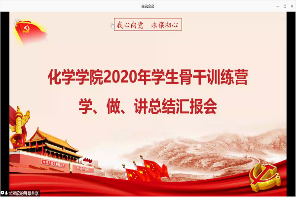 至此,化学学院2020年学生骨干训练营学、做、讲总结汇报会顺利结束。1908班入党积极分子刘忠航表示:“通过这次会议,我对于习近平新时代特色社会主义思想有了更深入的了解,以后会更多地在日常生活学习中主动学习党的理论知识,不忘初心,积极向党组织靠拢。”