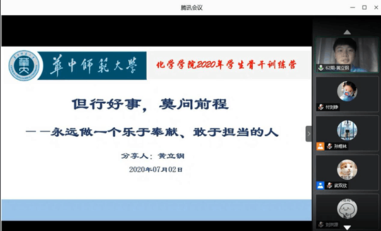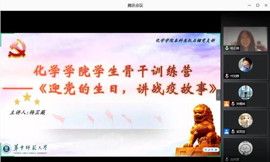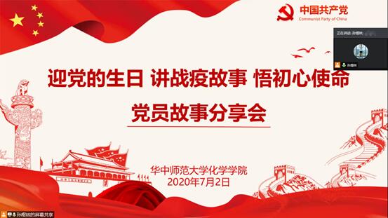 新闻中心消息 记者 祝冰倩 孟显琪7月2日晚,化学学院2020年学生骨干训练营活动之党员故事分享会于线上顺利举行。本次分享会以“迎党的生日 讲战疫故事 悟初心使命”为主题,旨在学习党的思想,将党“为人民服务”的宗旨与战疫特殊时期相结合的精神传递给大家并分享化学学院部分党员师生和入党积极分子的战疫故事。