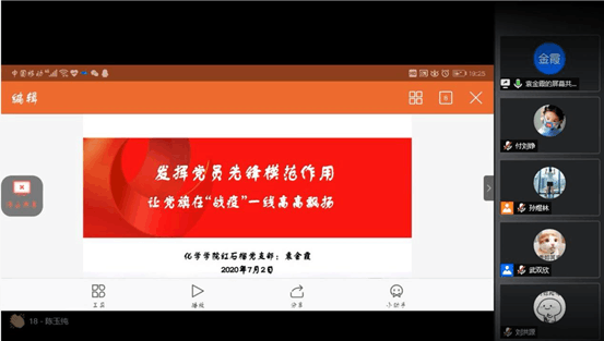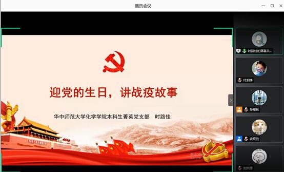 接下来,红石榴党支部党员代表袁金霞、杨芷薇,菁英党支部党员代表朱胜强、时路佳,入党积极分子代表黄立钢依次发言,他们分别讲述了疫情期间自己的战疫故事。袁金霞提到,从武汉回来后受到了无微不至的关爱和照顾,她对此十分感激;她也在会上分享了她在疫情期间担任社区志愿者和参与线上答疑活动的经历,当她辅导的学生向她表达自己想报考华中师范大学的意愿时,她感到十分的欣慰。