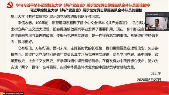 在学习回信精神的过程中,孙煜林详细介绍了陈望道同志与《共产党宣言》的渊源和《共产党宣言》展示馆的由来,并谈论了自己对回信精神的看法。他说道:“习总书记的这次回信的核心要义是坚定理想信念,矢志拼搏,面向未来,走好新时代的长征路。总书记的回信饱含了党中央对青年党员的殷切希望,写下了对青年成长成才的关心和关爱。历史是最好的教科书,也是最好的老师,习总书记在回信中告诉我们,学习‘四史’的目的是在学思践悟中坚定理想信念,在奋发有为中践行初心使命,以史鉴今,继续前进。希望大家能够再进一步坚定理想信念,进一步加强马克思主义理论和“四史”学习,为实现两个100年奋斗目标、实现中华民族伟大复兴的中国梦贡献智慧和力量,不辜负习总书记的期盼。”