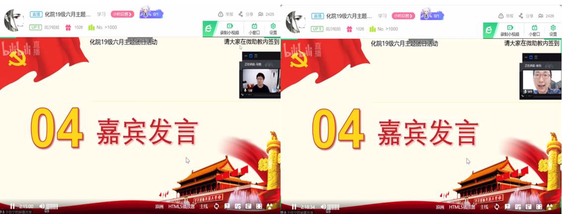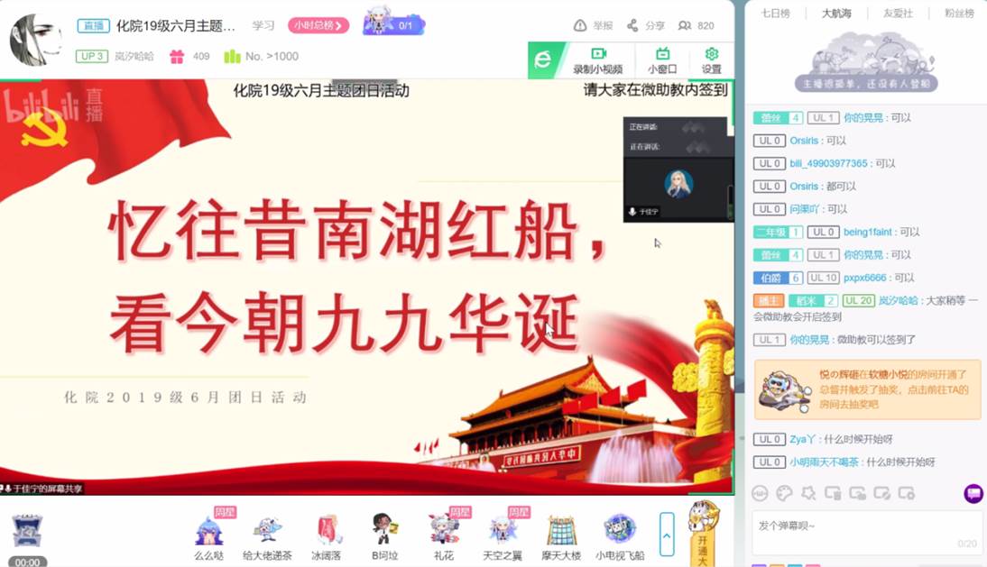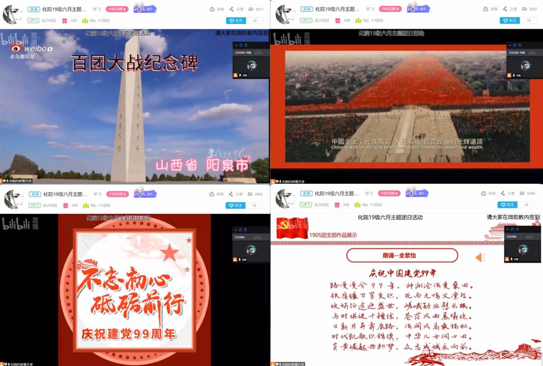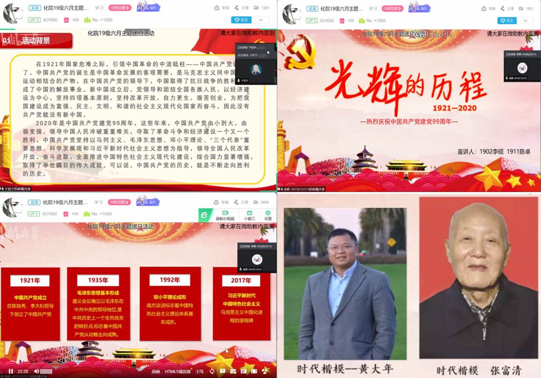 通讯员 付艳颖 为迎接中国共产党的99岁生日,帮助同学们了解党的历史,坚定理想信念,增强四个自信,不断提高听党话、跟党走的政治自觉,成长为担负民族复兴大任的时代新人,2019级团总支学生会于2020年6月28日在哔哩哔哩平台举办此次“忆往昔南湖红船,看今朝九九华诞”特别团日活动。此次活动邀请到的嘉宾有化学学院党委副书记徐芬老师,化学学院团委书记马莹老师,2019级辅导员武双欣老师,兼职辅导员张栩晨老师,班主任李伟国、孟思璇、黄雪英、许杪、周少林、杨文超及冯玲玲老师。