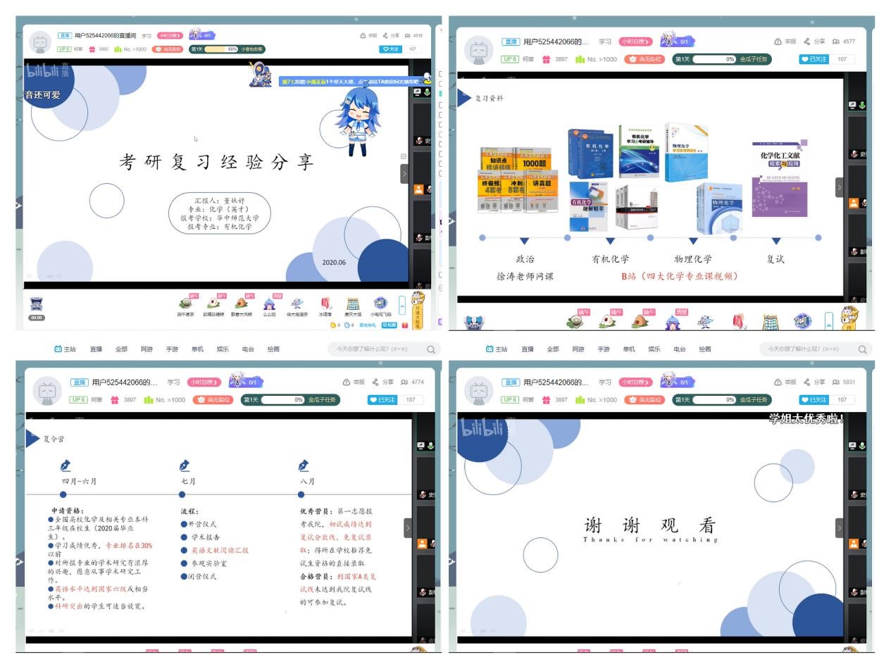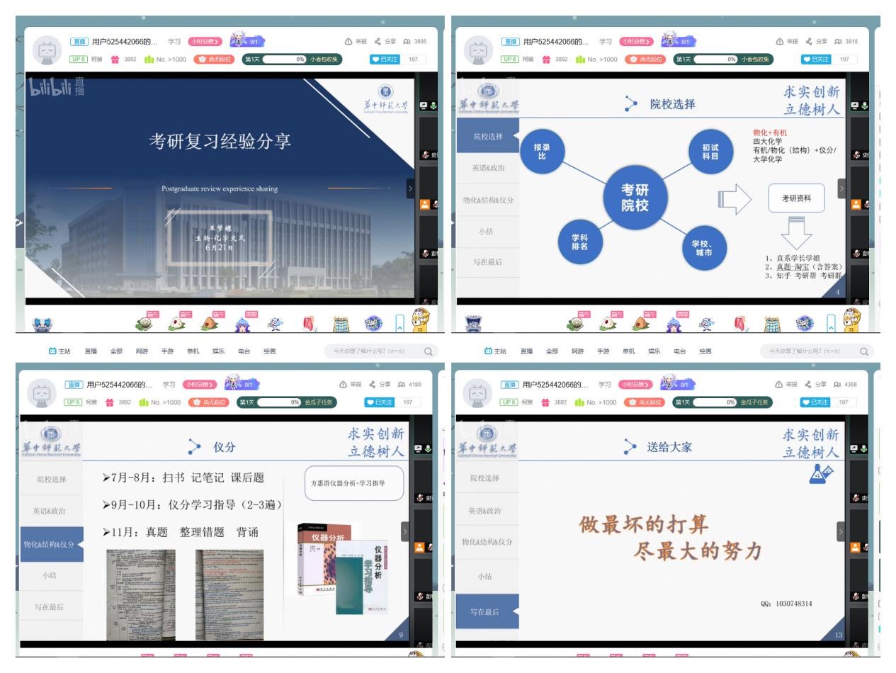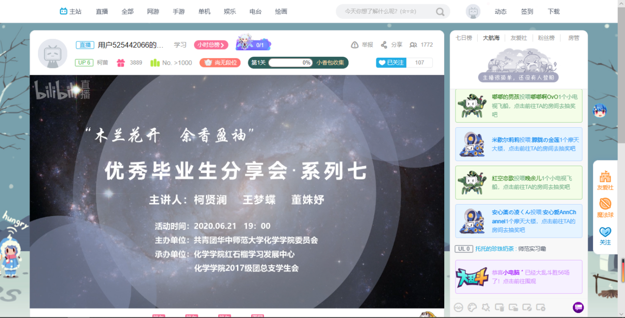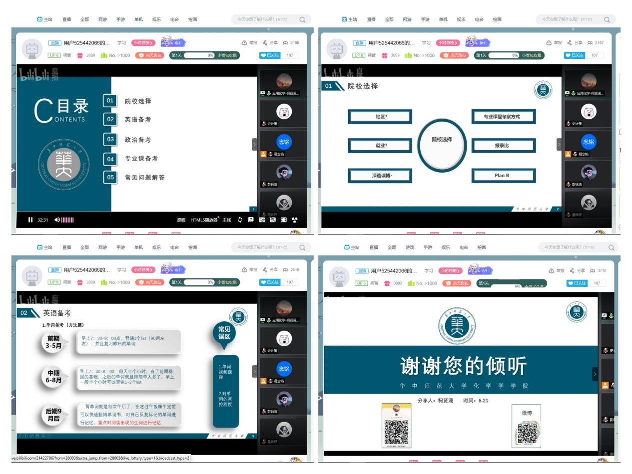 通讯员 刘润芝6月21日晚,华中师范大学化学学院2017级特色晚点名暨“木兰花开,余香盈袖”优秀毕业生分享会(第七期)在哔哩哔哩平台顺利举办。本次活动由共青团华中师范大学化学学院委员会主办、化学学院红石榴学习发展中心与化学学院2017级团总支学生会承办,2017级辅导员安晓蕾主持,2017级全体本科生参与。本次分享会邀请到的嘉宾有化学学院2016级本科生柯贤澜、王梦蝶和董姝妤。