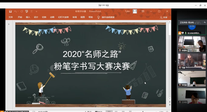 新闻中心消息 通讯员 刘润芝5月30日下午,由共青团华中师范大学化学学院委员会主办、化学学院2017级团总支学生会承办、化学学院2018、2019级团总支学生会协办的“名师之路”师范生技能大赛之粉笔字大赛决赛顺利举办。在疫情期间,此次活动采用线上的方式进行,通过腾讯会议平台进行粉笔字书写比赛。本次活动旨在以赛促练的方式,充分调动化院学子练习粉笔字的热情,提升粉笔字书写技能,丰富同学们的课余生活。