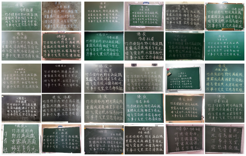 初赛阶段,以班级(年级)为单位推荐优秀作品进入复赛;复赛阶段,由评审小组对推选的作品从结构、字体、效果等方面进行综合评分,最终确定了30位同学晋级决赛。为了确保决赛现场的秩序,30位参赛选手被随机分为五个小组,每个小组由两位工作人员负责,选手须在主持人宣布比赛开始后的十分钟之内书写完指定内容,并在书写结束后的五分钟内将作品拍照上传,负责人将作品收集完毕后统一由专业评委进行打分与点评。