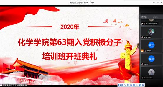(通讯员 刘晓)为了深入贯彻落实全国两会精神,喜迎建党99周年,6月3日,化学学院第63期入党积极分子培训班开班典礼在腾讯会议顺利举行。本次线上培训班遵照发展党员工作细则,按照学校党委统一部署和要求,依托国家教育行政学院大学生网络党校平台,由校党委组织部精心筹备举办。出席本次开班典礼的领导有化学学院党委书记邱宝国、党委副书记徐芬、党委副书记陈德均、党务干事于翔、培训班班长武双欣和培训班全体学员。