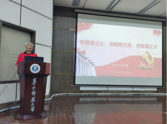 在祝心德退休后,我们了解到他继续凭着对党的感恩,为党干实事,担任汉口分校教学副校长,华中师范大学教务处本科督导组组长,党校组织员等等,他提出第一部人才培养方案 ,在全校所有的青年老师外聘老师的实验教学上发表十余篇的研究论文,并荣获了党的十七大知识竞赛一等奖等荣誉。在发言的最后,他满含深情地祝福伟大祖国更加繁荣昌盛,祝福中国共产党发展得越来越好,前途更加光明,人民生活更加幸福!