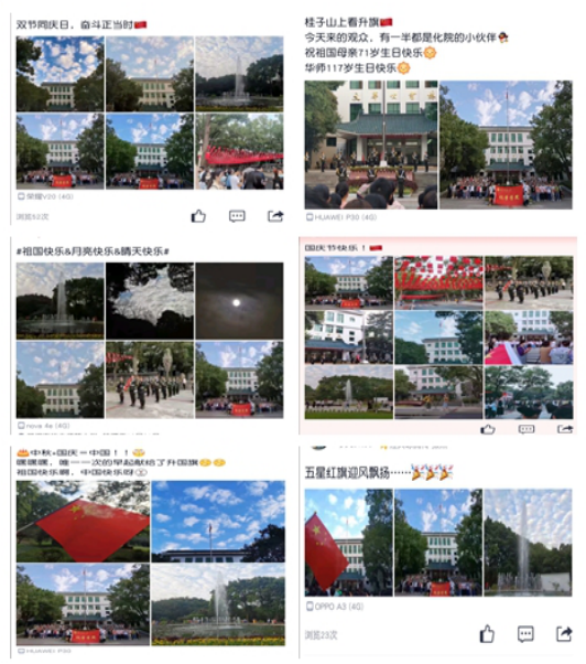 窗体底端随后,化学学院组织了在场的师生在国旗下进行了合影。在场的师生在看到庞大的升国旗阵容时,纷纷表示感受到了化学学院集体的力量。化学学院本科2017级姚庆晨同学说:“在祖国母亲七十一周岁生日之际,我们相约文华公书林,大学四年来,我已经在学校里观看过无数次升旗仪式,2020年是最不平凡的一年,疫情过后,我们重聚桂子山,逐渐回归正常的学习生活;今天的升旗仪式意义非凡,看到化学学院的老师和同学们热情洋溢,还有许多人在疫情期间发挥自己的一份力量,为抗击疫情做出了自己的贡献,看到这些,我就想到了中华儿女的伟大,想到了祖国的强盛和繁荣,在祖国七十一周岁之际,祝伟大的祖国繁荣昌盛,祝华师再谱华章。”化学学院本科2018级邓彦辉同学说:“看到这么多同学自发前往观看升旗仪式,共同为祖国庆生,十分的激动。国旗的缓缓升起,仿佛展现了祖国发展至今所走的艰辛道路。我定不负青春,不负韶华,不负时代,在飘扬的国旗的激励下,奔向前方。”化学学院本科2020级常欣月同学说:“民族自豪感还是挺强的,感觉中华民族都很团结(因为去的人很多,尤其是我们化院)很爱国,一大早起来参加这个升旗仪式,感觉同学们都很积极,感觉祖国一定会发得又快又好哒,也希望她能因为有我们而骄傲,中国冲鸭~”。化学学院本科2019级郑骧羊同学更是赋藏头诗一首为祖国庆生:“国骋双骐骥,庆向尧樽祝。快意且为乐,乐道随去处。”化学学院马莹老师感慨:“看到这么多同学自发前来参加升旗仪式,真的太感动了,我感觉这就是最好的爱国主义教育,我们的祖国一定会越来越好,祝祖国母亲七十一岁生日快乐。”化学学院原弘老师也说:“多次带孩子一起参加学校的升国旗活动,今年恰国庆、中秋双节,看完升国旗,又遇化院学子,他们声邀合影,为父为师的生活幸福满满!愿每个中国人都节日快乐!每天快乐!”。