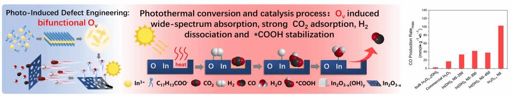 2月13日,材料顶级期刊《先进材料》(Advanced Materials)在线发表化学学院欧阳述昕教授团队和天津大学合作的二氧化碳还原成果。该研究通过光诱导二维氧化铟纳米片产生双功能的氧缺陷。光热制备技术产生氧缺陷的方法显著提高了活性位点的暴露浓度。高浓度的氧缺陷在提高材料光热转化效率的同时,提升光热催化二氧化碳还原的活性。富含氧缺陷的氧化铟纳米片刷新了光热催化二氧化碳还原产出一氧化碳的速率记录(图3)。此外,光热制备技术产生氧缺陷的优势还在于制备时间短,能够保持催化剂超薄的微观形貌。