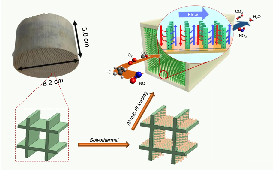 2月26日,Nature子刊《自然•通讯》在线发表了化学学院郭彦炳教授团队与美国康涅狄格大学Pu-Xian Gao教授团队合作在机动车尾气净化单原子催化剂领域的突出成果。化学学院郭彦炳教授为共同第一作者。贵金属单原子催化剂具有极高的反应活性以及选择性,但是其在严苛工业应用环境下的稳定性仍面临着较大的挑战。美国Pu-Xian Gao教授团队与郭彦炳教授团队结合水热法与浸渍法在堇青石蜂窝陶瓷表面生长合成了稳定的单原子Pt/TiO2纳米线阵列催化剂(图4)。该催化剂能够在低至160℃时,实现CO及HCs的污染物组分90%的转化,而其贵金属使用量仅为商业贵金属催化剂用量的1/5。研究表明,Pt占据了金红石型TiO2纳米线表面Ti空位,并被周围5个或6个相邻O离子稳定锚定,因而单原子Pt/TiO2纳米线阵列催化剂表现出优异的水热稳定性及抗硫性,具有极大的实际应用价值。