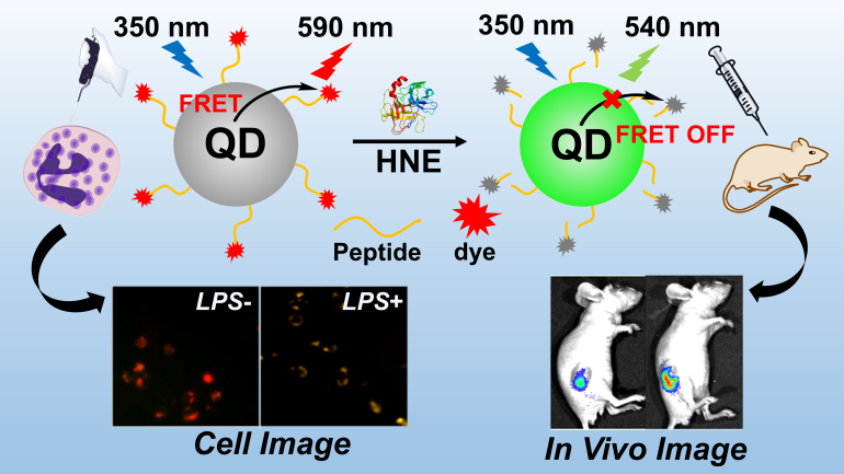 2020年3月,纳米研究领域著名杂志《ACS Nano》在线刊发了杨光富教授团队在分子诊断领域的最新研究成果(2020, 14, 4244-4254)。由于雾霾等大气污染的不断加剧,以及吸烟、人口老龄化等其他因素的影响,慢性阻塞性肺病(简称慢阻肺,包括慢性支气管炎、肺气肿、肺心病)、支气管哮喘、肺癌以及肺部感染等呼吸系统疾病的发病率和死亡率近年来急剧上升。因此,发展可用于肺部疾病诊断与治疗的智能传感方法具有重要意义。人中性粒细胞弹性蛋白酶(HNE)是反映肺部疾病发展进程的重要生物标志物,也是开发药物的重要靶标(例如,以HNE为作用靶标的西维来司钠被列入新冠肺炎的治疗药物),该团队发展了一种基于量子点的荧光共振能量转移技术,构建了一个结构新颖的靶向HNE的纳米探针,从细胞和活体水平上实现了对HNE的灵敏、快速、特异性检测与成像(图7)。此外,该团队与华中科技大学同济医院合作,利用该荧光探针对部分肺癌和慢阻肺患者血清进行了检测,取得了显著效果。这一研究为发展靶向生物大分子的智能传感技术提供了一种普适性策略,具有广泛的临床应用前景。该文章的通讯作者为杨光富和杨文超教授。
