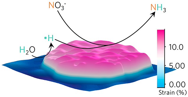 相较于惰性N≡N化学键,硝酸根中N=O键强稍弱,加氢还原能垒低,因此有望以广泛存在的硝酸盐为原料高效电催化合成氨。化学学院张礼知教授团队与香港中文大学Jimmy C. Yu教授合作,设计了一种次表面氧掺杂诱导的应变钌纳米团簇作为电还原硝酸盐合成氨催化剂。该应变钌纳米团簇通过提高氢-氢耦合势垒有效地抑制了HER副反应,促进了氢自由基的形成,加速了硝酸盐还原势垒限速步的中间体加氢过程,实现了近乎100%的氨选择性和高于Haber-Bosch工艺的合成氨速率(图2)。相关结果于3月30日发表在《美国化学会志》(Journalofthe American Chemical Society)上(doi:10.1021/jacs.0c00418)。