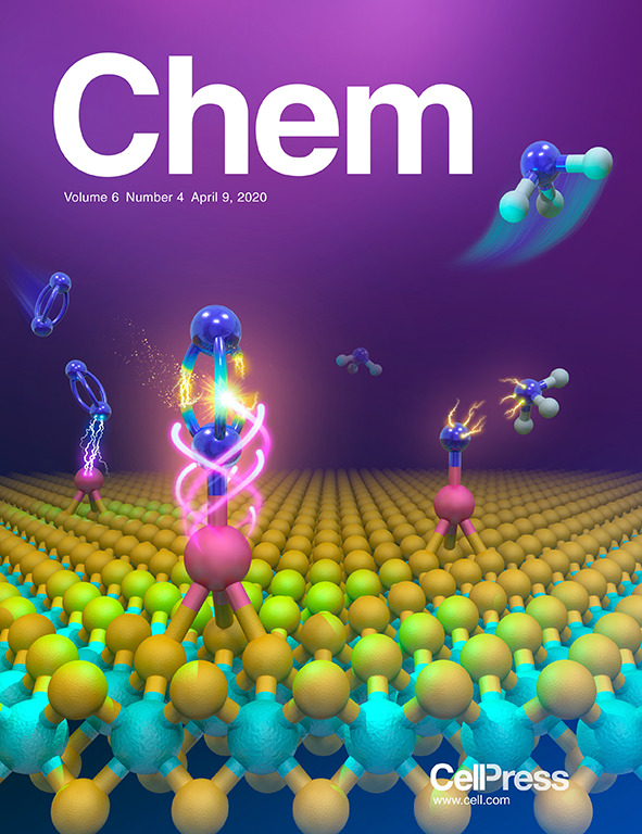 2020年1月以来,张礼知教授课题组已在电催化合成氨领域取得两项重大突破。氨气是制备肥料等其它化工产品的重要原料。Haber-Bosch反应是目前工业合成氨最主要的方法,但它反应条件苛刻,消耗大量化石燃料且污染环境。电催化合成氨利用可持续电能常温常压、水相体系合成氨,有望成为Haber-Bosch反应的替代过程。以氮气为反应气的电催化合成氨过程,氮气还原过程能垒高,导致电催化合成氨选择性低、产氨速率低。因此,设计高效活化、削弱N≡N化学键的电催化材料是该领域的关键科学问题。化学学院张礼知教授团队提出单原子界面极化策略以促进N≡N活化、断裂。将过渡金属原子精确沉积到单层硫化钼表面,构筑了高曲率“凸起物”型单原子催化结构。该结构向外释放强电场,极化氮气,诱导产生界面极化场,促进电子注入氮气反键轨道,实现了高效电催化还原氮气合成氨(图1)。相关结果于2月13日发表在Cell Press旗下期刊Chem上(Chem 2020, 6, 885-901),并被选为2020年4月Chem封面论文。