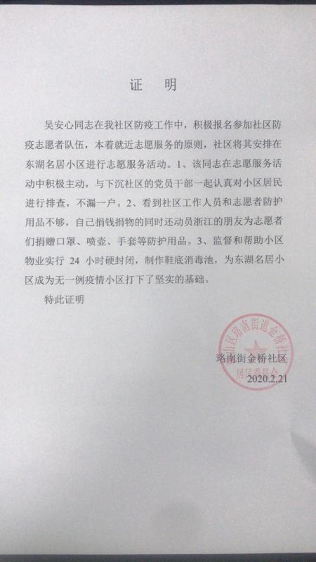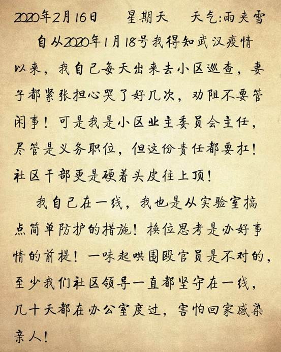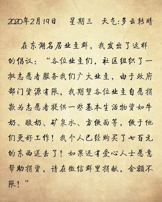 在1月18日,吴老师得知了武汉的新型冠状病毒肺炎疫情相关情况以后,他本人就开始自发在小区内进行巡查、劝导,协助社区开展疫情防控工作。他参与社区工作已经有一个多月了,期间为东湖名居小区的疫情防控做出了巨大的贡献,东湖名居小区也是到目前为止洪山区内少数几个没有出现疫情的小区之一。不仅如此,自1月18日以来,他每天还坚持写《抗疫日记》来记录自己在直面疫情过程中的想法、思考以及一些好的做法,并分享给自己的研究生,至今已经写了30余篇,他希望能够借此感染、引导学生,能让他们在大灾大难中体验生活世情。