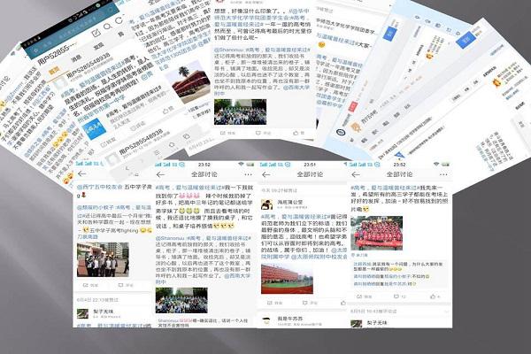 在线上互动过程中,1305班的同学通过微博、贴吧、QQ等各种网络渠道为自己母校的高三学子送去诚挚的祝福,并分享自己在高考前后的点点滴滴。还在微博上发起了话题——“高考,爱与温暖曾经来过”。1305团支部的同学们都积极参与了此话题的讨论,在讨论中流露出对高三学子深深的祝福。