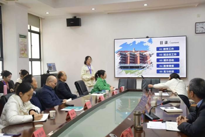 随后,实习生代表大组长杨钰泉汇报组内实习工作,分享了实习期间的收获与感悟。实习期间,平均每个学科小组听课210节,授课36节,全面参与到教学工作和班主任工作中;小组成员将理论与实践结合,总计完成教育调查15篇。她谈到,从最初打磨教案时的“细节斟酌”,到站上讲台后的“节奏把控”,指导教师的逐字指导让同学们逐渐理解了教学是理论与实践的双向奔赴;而在班主任工作中,从组织课间操、策划班会到参与学校活动,琐碎的日常让大家真切体会到教育是浸润式的陪伴,每一个细节都藏着对学生成长的关照。