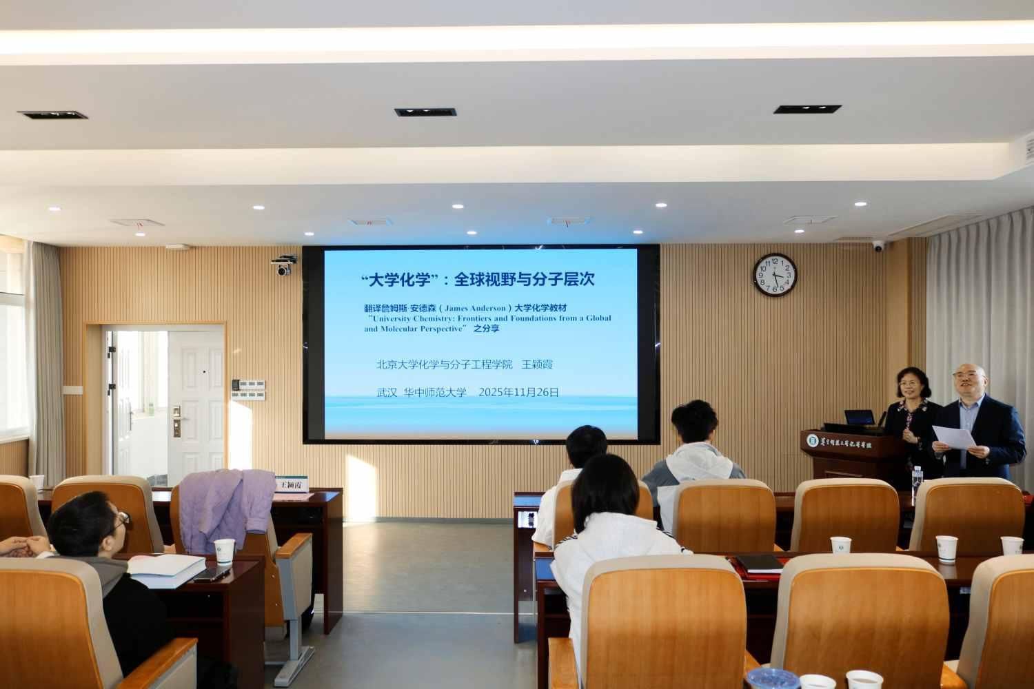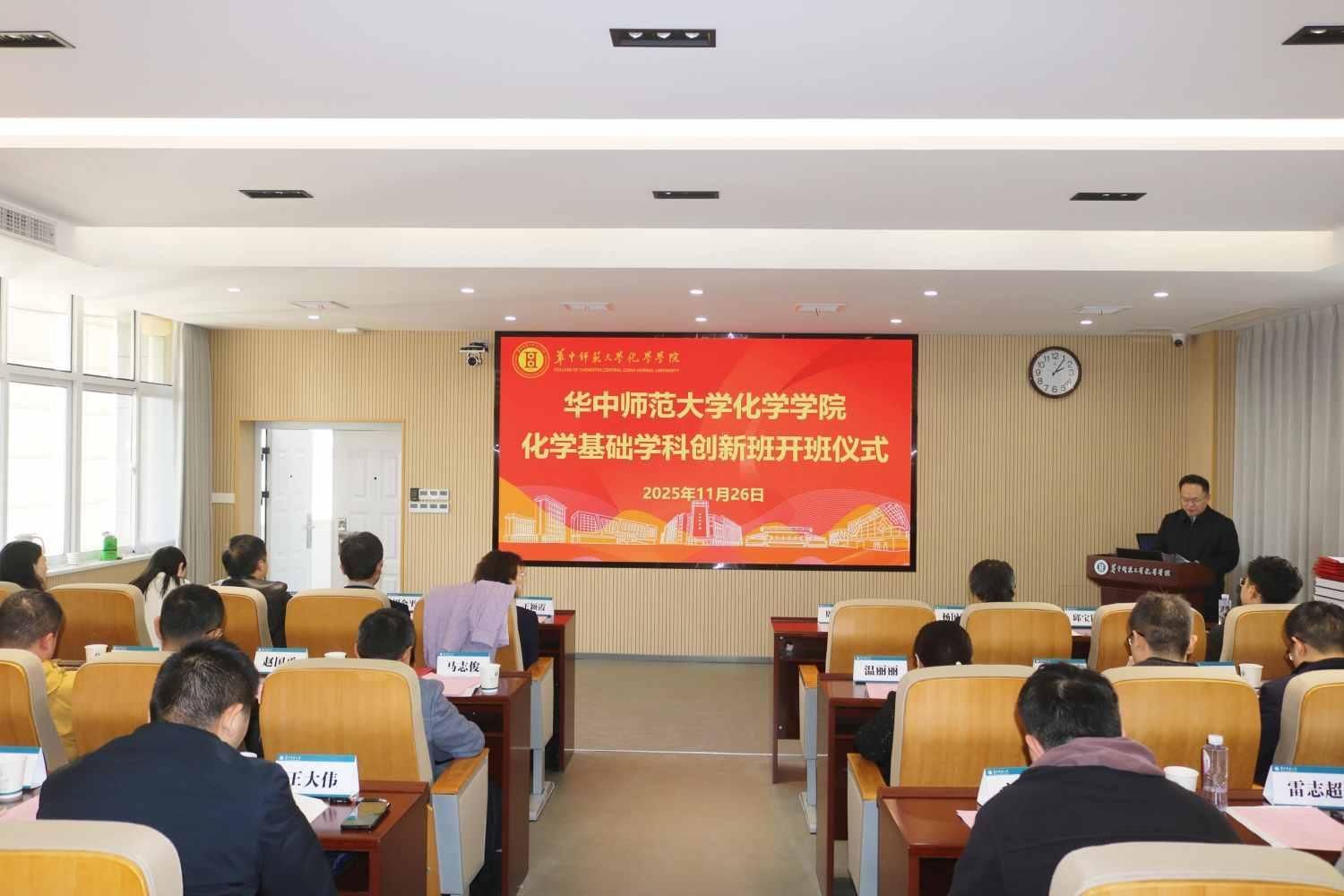 11月26日,华中师范大学化学学院基础学科创新实验班开班仪式在H501会议室隆重举行。本次开班仪式汇聚学界专家、校院领导、合作中学代表及师生代表,共同见证这一聚焦中学化学奥赛教练人才培养的重要时刻,为基础学科拔尖人才培养注入新动能。北京大学化学与分子工程学院王颖霞教授、武汉大学化学与分子科学学院周金平教授受邀莅临指导。华中师范大学副校长周鹏程,本科生院院长刘清堂、副院长李静、陈娟,华中师范大学第一附属中学党委书记杨国红、主任方纲及马志俊、赵国勇、宋珏、耿景行四位奥赛教练出席仪式。化学学院党委书记邱宝国、党委副书记朱峰、副院长原弘,陆良秋、王大伟、雷鸿辉、舒超、刘晓、张国柱、徐浩、温丽丽、陈建、雷志超、刘春荣、潘方方、方正平等14位学院骨干教师与基础创新实验班26名学子参与活动。仪式由原弘主持。