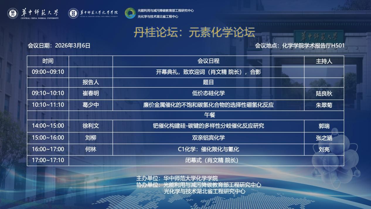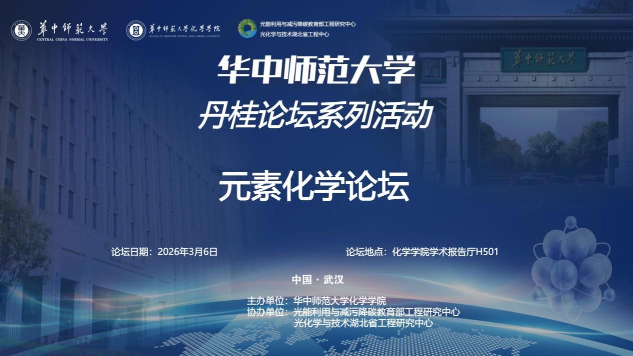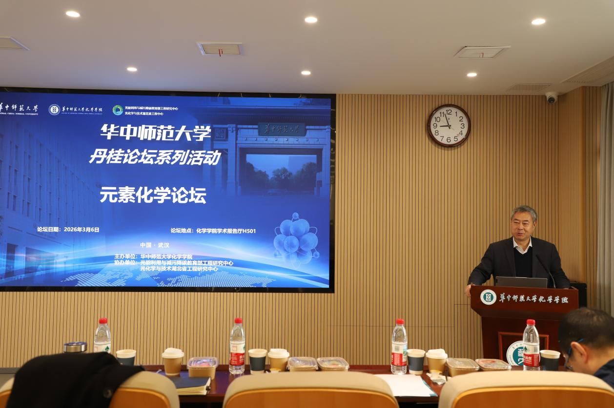 3月6日,“丹桂论坛:元素化学论坛”在化学学院H501学术报告厅顺利举行。本次论坛由华中师范大学化学学院主办,光能利用与减污降碳教育部工程研究中心与光化学与技术湖北省工程研究中心协办。来自国内外多所高校和科研机构的知名学者齐聚一堂,围绕元素化学及相关领域的前沿研究进展展开深入交流。