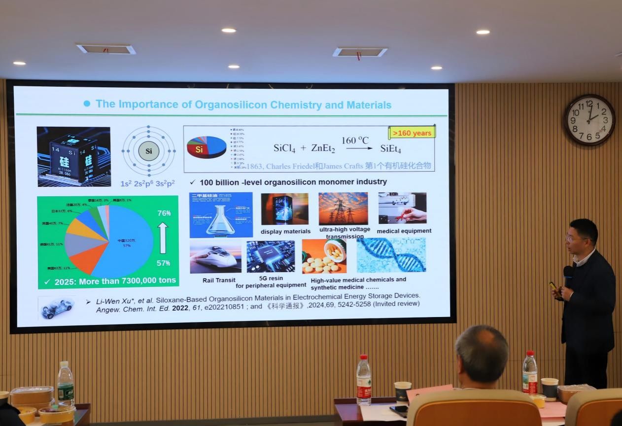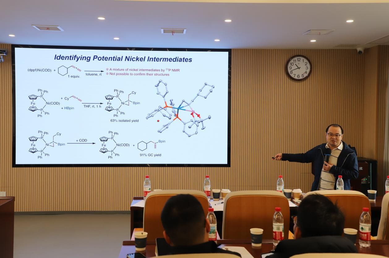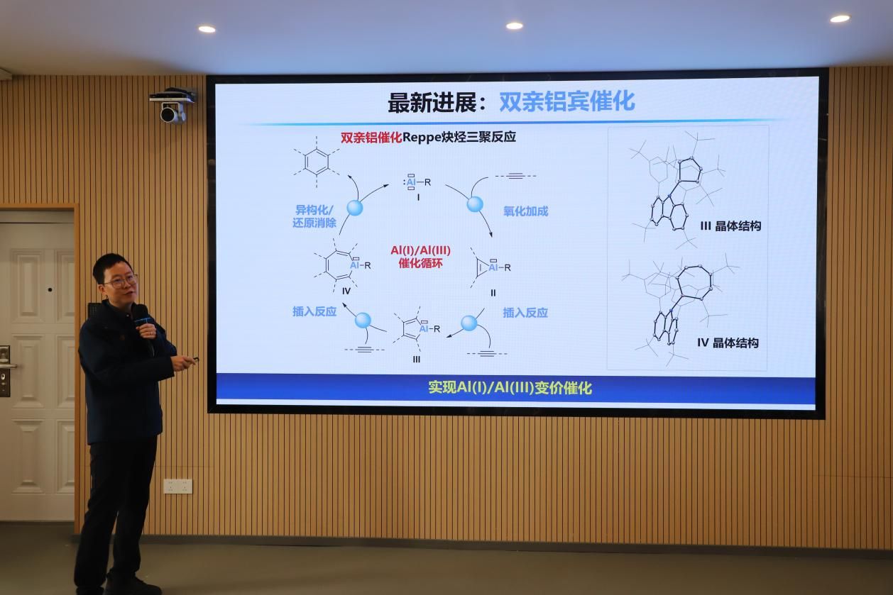 在特邀报告环节,多位专家分别就元素化学及相关研究领域作了精彩报告。崔春明教授(南开大学)作题为“低价态硅化学”的报告,系统介绍了其团队在主族元素有机化学领域的重要研究进展,展示了低价态硅化合物在结构与反应性方面的独特性质。随后,葛少中副教授(新加坡国立大学)以“廉价金属催化的不饱和碳氢化合物的选择性硼氢化反应”为题,分享了其团队在廉价金属催化方面的最新成果,重点介绍了在镍、钴、铜等过渡金属催化体系中实现高选择性转化的策略与机制研究。下午的报告同样精彩纷呈。徐利文教授(杭州师范大学)围绕“钯催化构建硅–碳键的多样性分岐催化反应研究”,介绍了其团队在有机硅化学与均相催化领域的系统性成果,展示了“分岐催化”策略在构筑硅–碳键中的重要应用。随后,刘柳研究员(南方科技大学)作了题为“双亲铝宾化学”的报告,介绍了其团队在双亲性铝宾化合物设计与反应转化方面的突破性研究,为主族元素化学研究提供了新的思路。最后,何林研究员(中国科学院兰州化学物理研究所)以“C1化学:催化羰化与氰化”为主题,分享了其团队在CO、CO₂及CN⁻等C1资源高值化利用方面的最新进展,展示了催化体系在高选择性合成中的重要作用。在报告交流环节,与会师生围绕元素有机化学、催化反应机理以及新型功能材料等问题与报告专家展开了热烈讨论,现场学术氛围浓厚。此次论坛不仅展示了元素化学领域的最新研究成果,也为不同研究方向的学者提供了良好的交流平台。