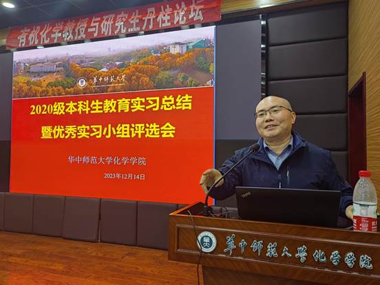 在会议的最后,化学学院教育实习负责人王世存进行了总结讲话。他指出,在今天的总结大会中,实习生们相互交流,在教学管理、科研等方面得到升华,他也希望实习生们能够在实习过程中进行反思。王世存还介绍了优秀实习小组和优秀实习生的评选规则,以及后续的工作。