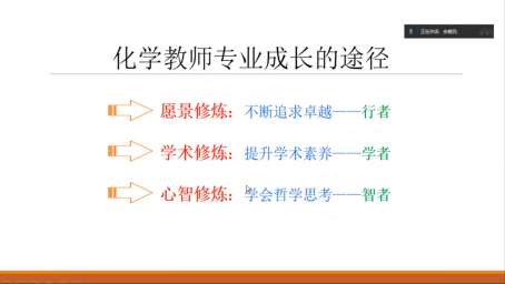 佘爱民老师首先结合自己所在的雅礼中学进行了一个简单的自我介绍,紧接着就步入主题——成长型思维模式下的教师专业如何发展。接下来,佘爱民谈及自己在青年教师期间曾遇到过的 “八缺”“八不缺”问题,结合自身经历,分享一名化学教师的成长之路。