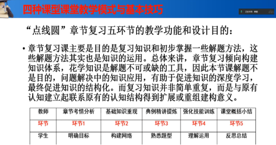 接着,黄颖老师介绍了复习课的“两模式五环节”。“两模式”分别指的是章节复习的“点线圆”复习法和专题复习的“串珍珠”复习法,在这两个复习方法里共同体现复习课的“五环节”,以此帮助同学们构建知识网络。黄颖老师指出复习课教学模式以理论为依据,以经验为基础,以顺利高效完成学科任务实现学生学科素养培育为目标,既是对以往教学经验的总结和提升,也是为追求本学科复习效应最大化的相对稳定的操作范式。