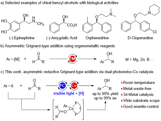 手性苄醇是一类非常有意义的手性骨架,广泛存在于许多天然产物与生物活性分子中(图1a)。同时,这类分子还是不对称合成中的重要中间体。因此,发展手性苄醇的高效、高选择性合成策略与方法一直是现代合成化学的一个重要研究内容。其中,过渡金属催化的有机金属试剂对羰基化合物的不对称Grignard-type加成(图1b)无疑为手性苄醇的合成提供了一条有效的途径。然而,有机金属试剂的使用往往导致反应官能团相容性差、条件苛刻等不足,一定程度上阻碍了这一策略的实际应用。近年来,化学家们将芳基卤化物代替金属试剂,通过使用当量的金属还原剂发展了不对称的还原Grignard-type加成,为解决这一难题提供了新的思路。